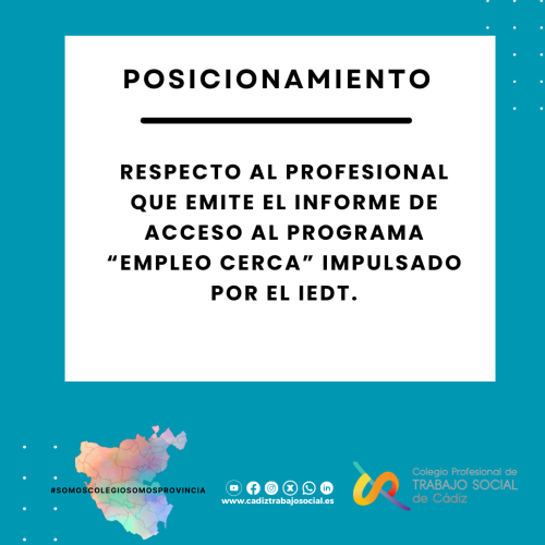 El Colegio Profesional de Trabajo Social de Cádiz comparte a través de esta publicación y en sus redes sociales su posicionamiento respecto al procedimiento de acreditación para acceder al programa EMPLEO CERCA impulsado por el IEDT (Instituto de Empleo y Desarrollo Socioeconómico y Tecnológico) de la Diputación de Cádiz.