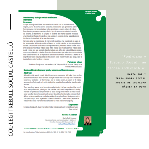 Castelló, 24/07/2023.- ‘Feminismo y trabajo social: un tándem indivisible’. Este es el título del artículo publicado por nuestra compañera y colegiada de COTS Castelló Marta Sorlí, Trabajadora Social, Agente de Igualdad y Máster en Derechos Humanos, en la revista ‘Servicios Sociales y Política Social’ que edita el Consejo General de Trabajo Social. Esta publicación tiene como misión ser la voz de las inquietudes del Trabajo Social en España, y ofrecer artículos de calidad e información de interés para las y los profesionales de lo social.
