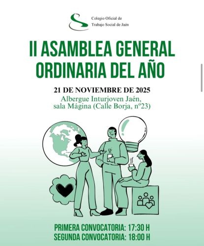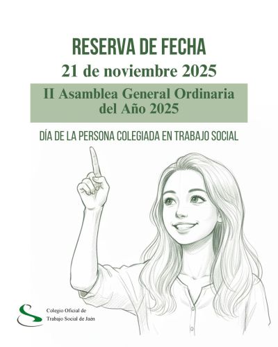 Reserva la fecha 21 de Noviembre de 2025, el Colegio Oficial de Trabajo Social de Jaén celebrará la II ASAMBLEA GENERAL ORDINARIA DEL AÑO 2025.