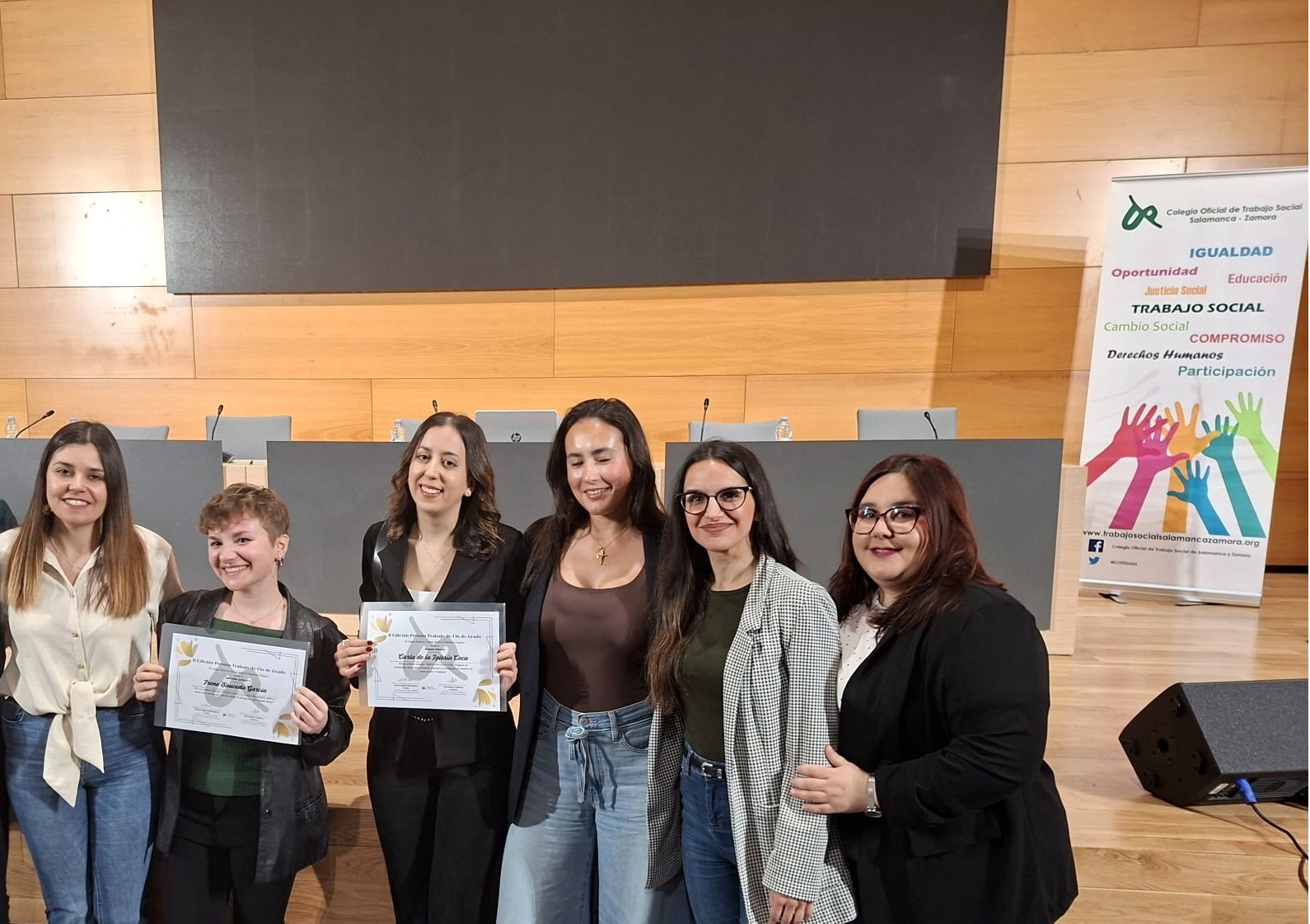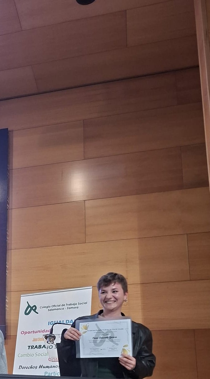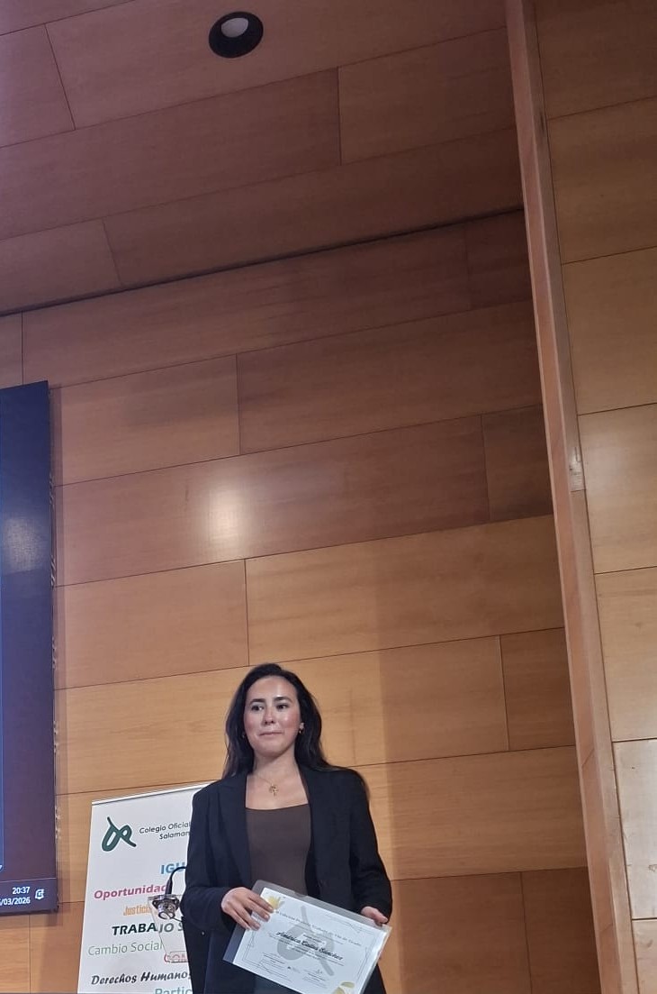 En el desarrollo de la jornada entregamos el Premio al Mejor Trabajo de Fin de Grado en Trabajo Social del curso académico 2024/25 a Carla de la Iglesia Coca por su trabajo titulado BREAKING BULLYING: Proyecto de Innovación Social para Prevenir, Detectar y Concienciar en Materia de Acoso Escolar o Bullying”, contando a su vez con la participación de la premiada, quién trasladó a los asistentes unas breves palabras sobre su trabajo.
